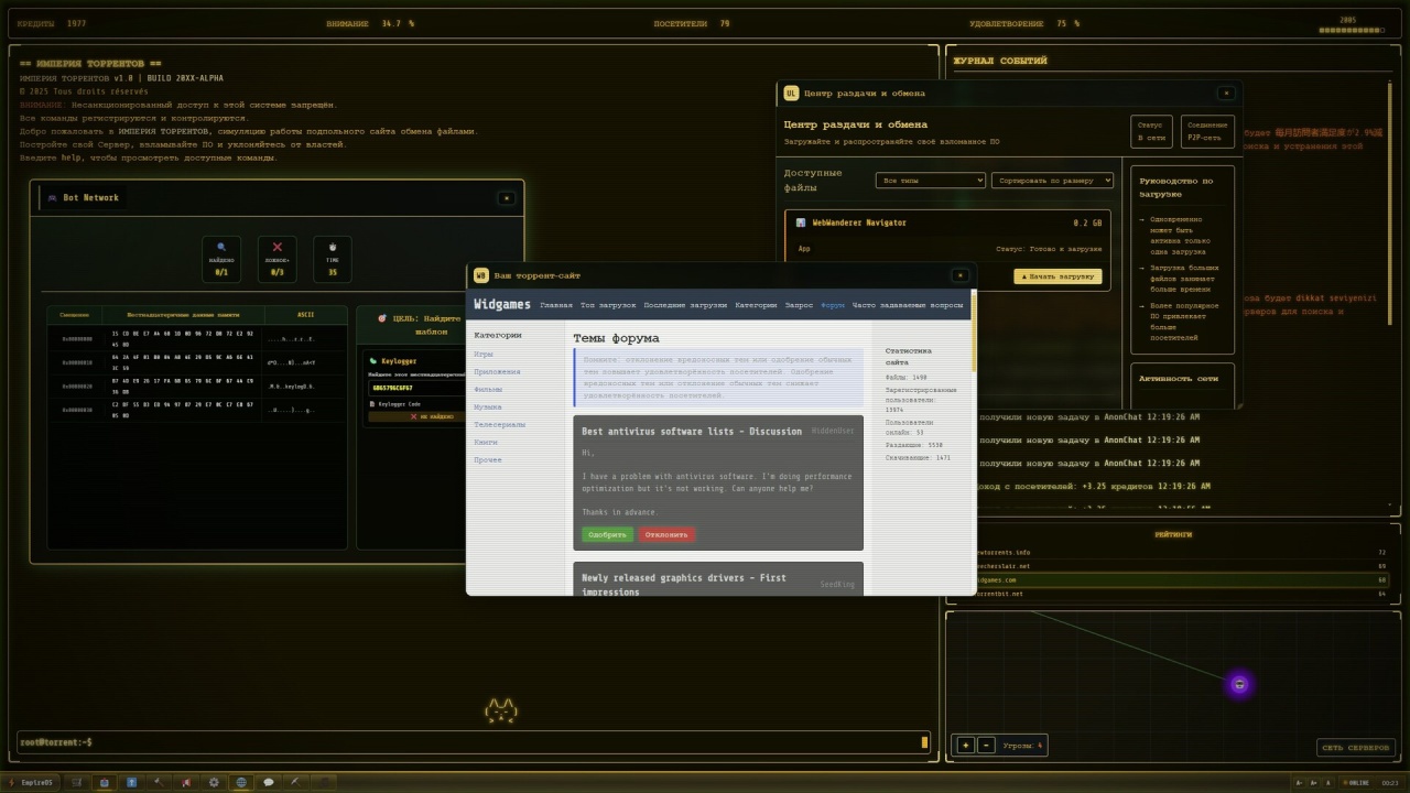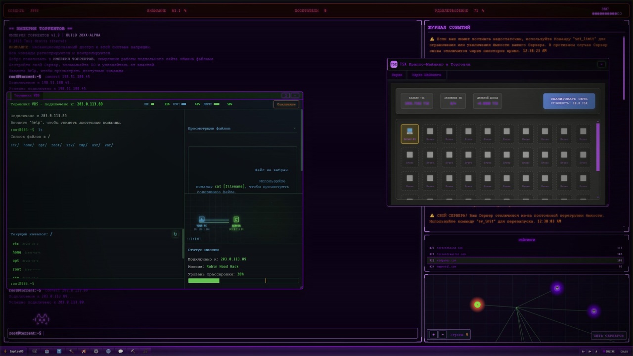 Torrent Empire — это симулятор создания собственной пиратской державы, разворачивающийся в декорациях цифрового подполья эпохи 2000-х годов. Вся деятельность по возведению теневой сети распространения контента представлена в формате стратегического проекта с интерфейсом, имитирующим командную строку терминала. Фундаментом для расширения влияния становятся успешное администрирование серверной инфраструктуры и методичный взлом программного обеспечения. Геймерам предстоит погрузиться в сложную систему правосудия, где каждое действие имеет свои последствия и требует взвешенного подхода к принятию решений. Основная задача заключается в постоянном наращивании мощностей и привлечении новой аудитории для своей подпольной сети.