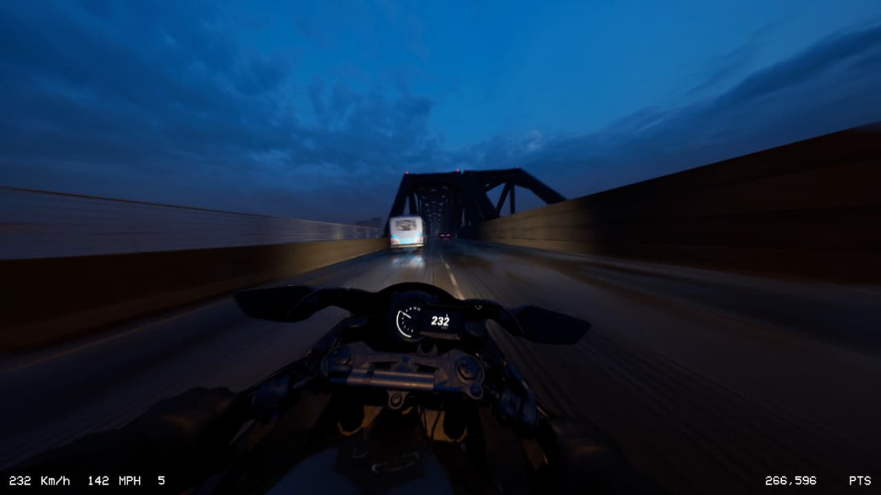 LANESPLIT — симулятор скоростных заездов на мотоцикле, в котором основной задачей становится рискованное маневрирование в плотном потоке машин. Весь игровой процесс построен вокруг лавирования между рядами на предельной скорости, требуя от пилота максимальной концентрации и молниеносной реакции. Ощущение скорости достигается за счет проработанной физической модели, визуальных эффектов размытия и адаптивного звукового дизайна. Динамичный саундтрек в стиле драм-н-бейс напрямую зависит от показаний спидометра, усиливая эффект погружения и обрываясь в момент столкновения. Система начисления очков поощряет агрессивный стиль вождения: чем выше скорость и меньше дистанция до других автомобилей, тем значительнее итоговый множитель. Любая ошибка или существенное замедление приводит к аннулированию текущего прогресса.