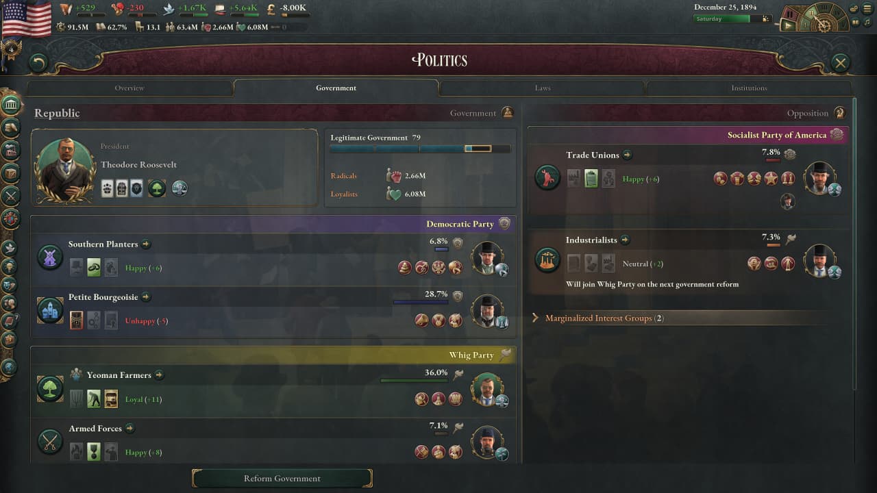 В игре представлено пару десятков стран, где под контроль попадает промышленность, сельское хозяйство и другие сферы, которые юзеру необходимо развивать на выбор, действуя путем радикальным или мирным. В каждом государстве обитают слои населения, у каждого из которых отдельное политическое мнение и экономические проблемы. Задачей пользователя становится создать прогрессивное общество, постепенно производя реформы, обновляя конституцию и пытаясь выступить за традиционные ценности. Попутно необходимо изучать новые технологии, внедрять разные идеи, чтобы развивать державу.