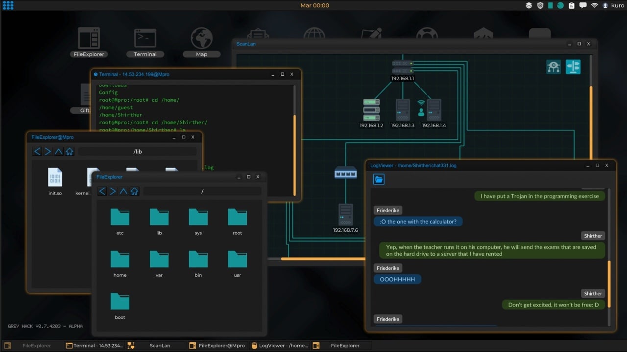 Многопользовательская игра Grey Hack дает возможность почувствовать себя в роли профессионального хакера. Игроку доступна полная свобода действий в процедурно генерирующейся мировой веб-сети. В начале игры доступно всего несколько программ, среди которых File Explorer, Text Editor и Terminal. По мере того, как растет хакерский скилл, появятся множество новых утилит и откроется широкий спектр возможностей.