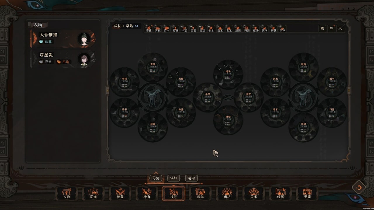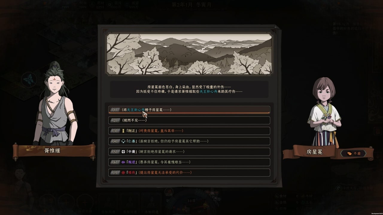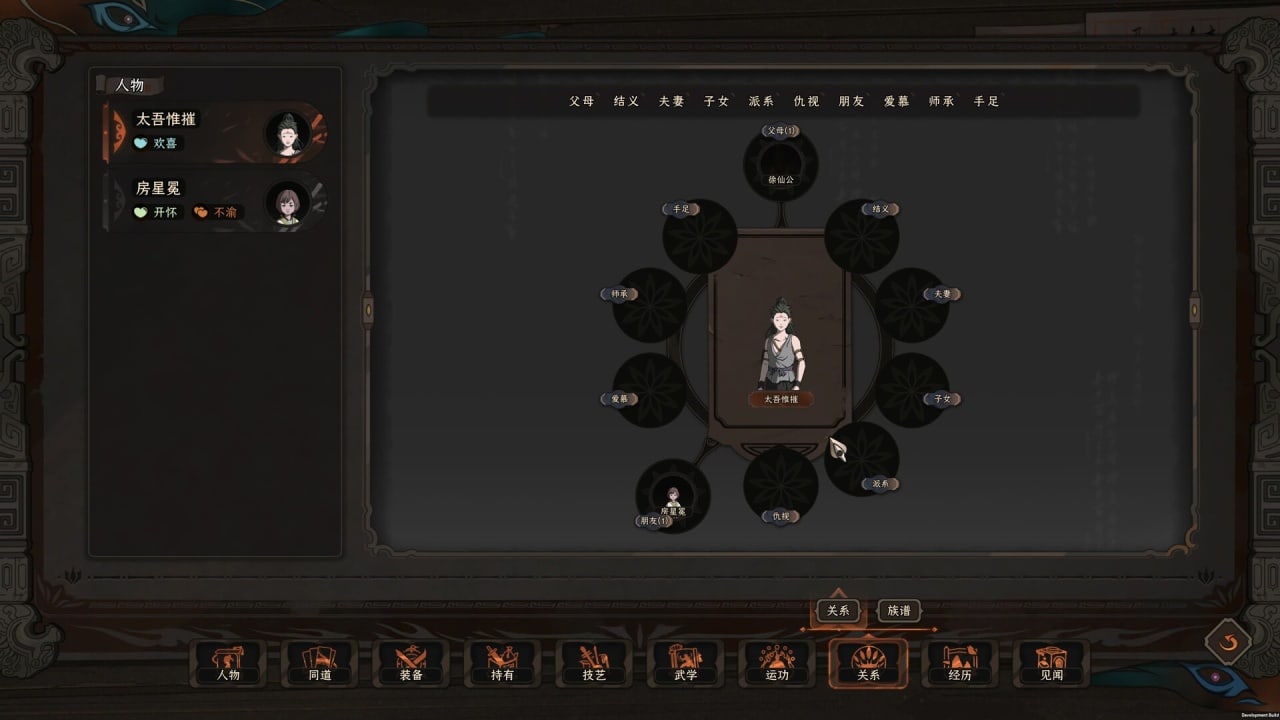 У персонажей есть очки действий, которые нужны для посещения локаций и сбора ресурсов. Когда запас очков потрачен, начинается новый месяц, где происходят события, основанные на прошлых выборах и близком окружении. Способности в The Scroll of Taiwu делятся на 2 типа: боевые и жизненные. Для их прокачки доступны книги, также есть 15 фракций, где можно изучать другие навыки. Чтобы разблокировать умение, нужно обладать достаточным уровнем поддержки членов соответствующей фракции. У героев есть характер, который влияет на результат определенных действий и исход приключений. Можно встать на путь справедливого добряка, эгоиста или мятежника. Но если персонаж будет выбирать действие, противоречащее его качествам, то может впасть в депрессию или поменять личность.